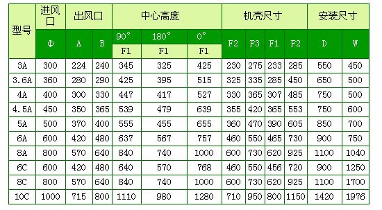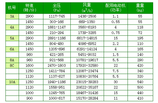 A式為葉輪和電機直聯(lián),C式二種,900轉(zhuǎn)-1250轉(zhuǎn)為軸座傳動,1250轉(zhuǎn)-1600轉(zhuǎn)為軸承箱傳動
